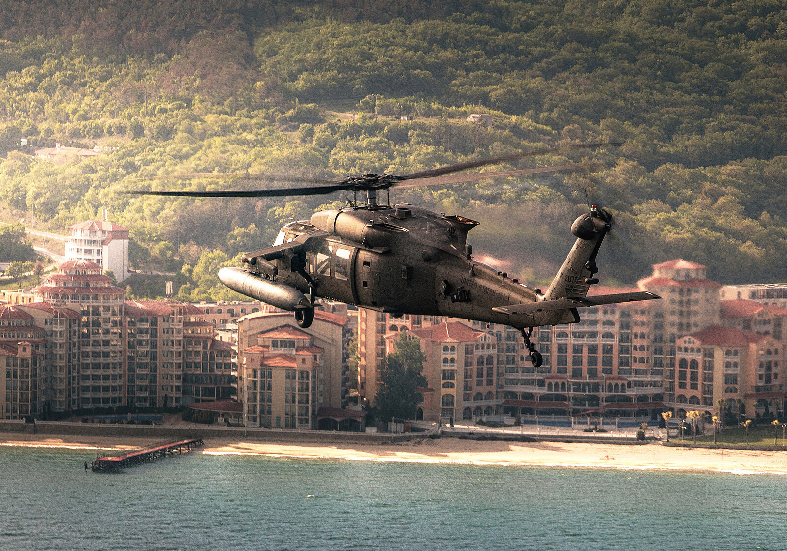 Americký UH-60 Black Hawk u pobřeží Černého moře v Bulharsku na cvičení Defender Europe 21