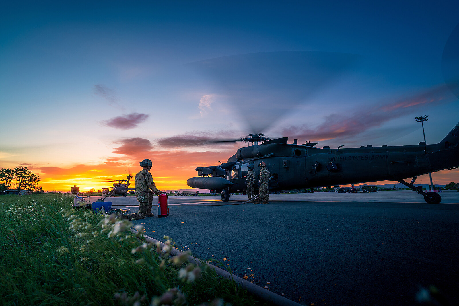 Vrtulníky UH-60 Black Hawk americké armády doplňují plaivo během přeletu z Německa do Bulharska na cvičení Defender Europe 21