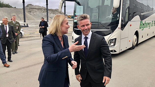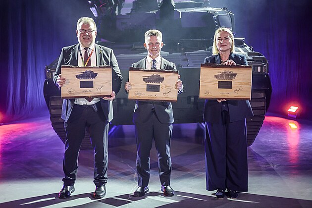 éf BAE Systems Hägglunds Tommy Gustafsson-Rask, védský ministr obrany Pål Jonson a ministryně obrany Jana Černochová během slavnostního odhalení prvního vyrobeného obrněnce CV90 pro českou armádu ve védsku (28. srpna 2025)