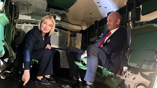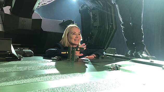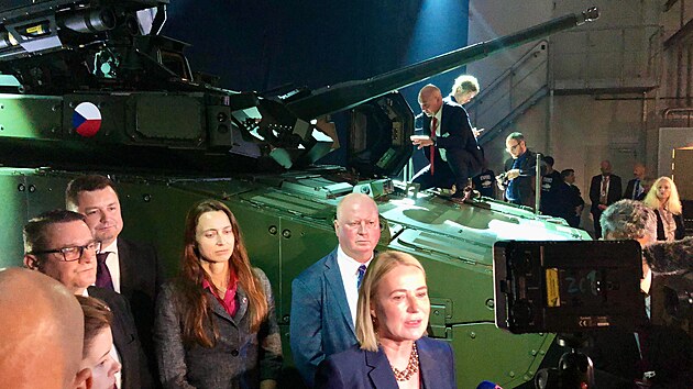 Ministryně obrany Jana Černochová na slavnostním odhalení prvního vyrobeného obrněnce CV90 pro českou armádu ve védsku (28. srpna 2025)