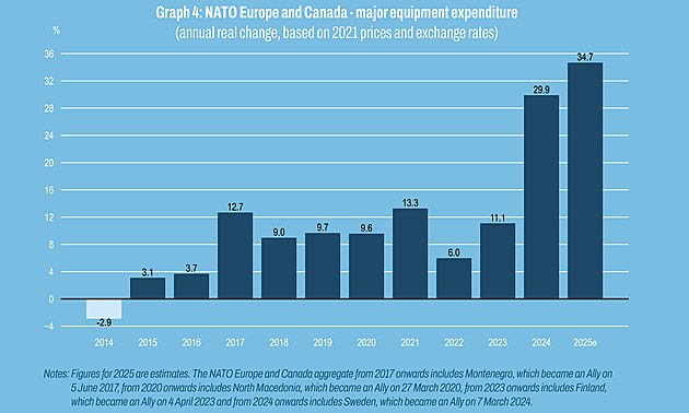Výdaje na obranu evropských zemí NATO a Kanady do hlavního vojenského vybavení od roku 2014