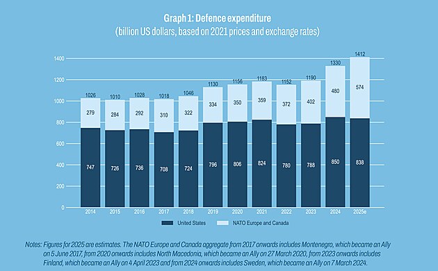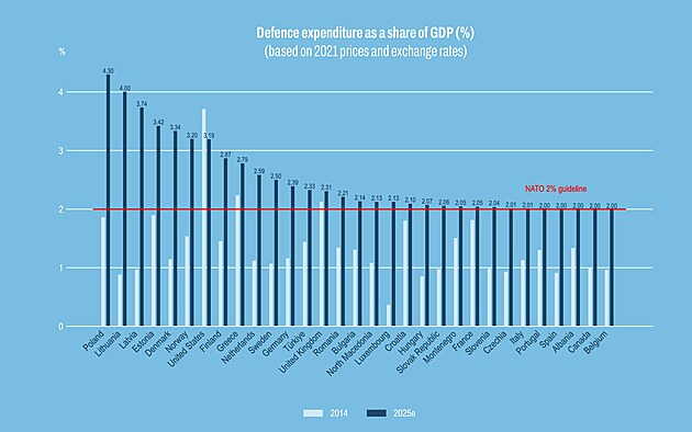 Srovnání výdajů na obranu zemí NATO za rok 2025 per capita, tedy kolik stát dává na obranu každého občana. Poprvé v zaznamenané historii v tomto ohledu nedrží první pozici Spojené státy