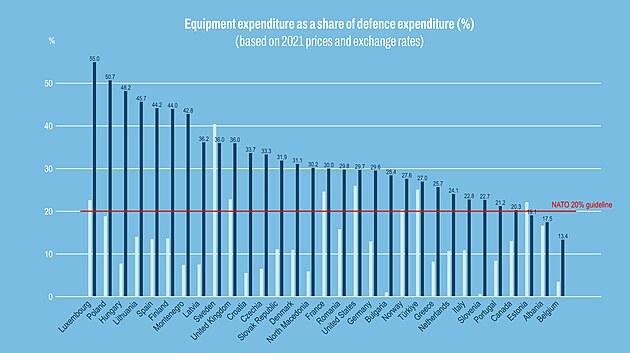 Podíl výdajů na obranu jednotlivých zemí NATO na hlavní vojenské vybavení za rok 2025.