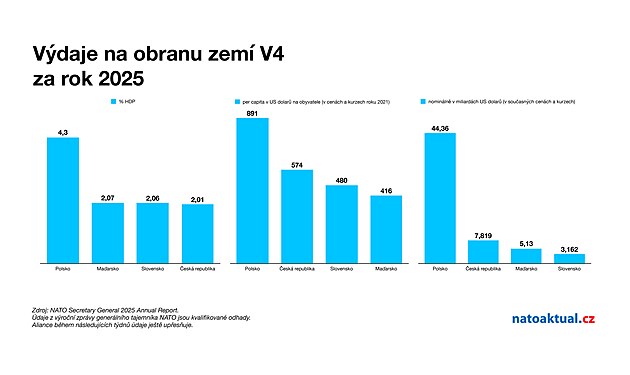 Srovnání výdajů na obranu za rok 2025 států V4. První graf ukazuje vyjádření procentem k HDP, druhý výdaje na obyvatele za rok a třetí nominální výdaje za rok