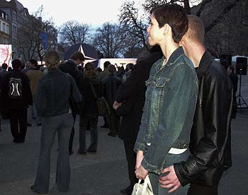 Na druhé straně náměstí pyrotechnici zapalují znak aliance. Za prudkým světlem ve večerním šeru se otáčejí snad všichni z asi dvou tisícovek lidí.