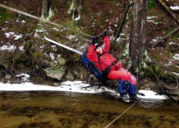 Účastník extrémního závodu Winter Survival 2003 překonává s veškerou výbavou na zádech horskou bystřinu. |